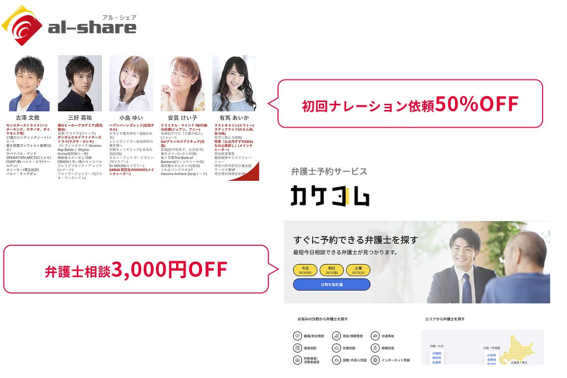 ナレーション依頼や弁護士相談などビジネスやクリエイティブ活動を支える各種サービスをお得に利用することができます。