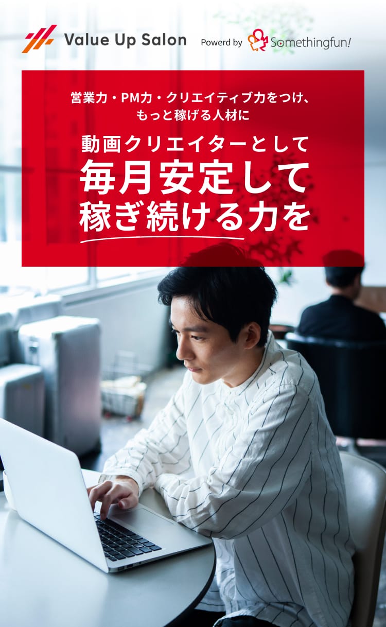バリューアップサロンでは、営業力やPM力、抽象度の高い案件をこなす方法、仕組化の方法など「客数」と「客単価」を上げるためのノウハウを学び、安定して高収入を稼ぎ続ける動画クリエイター(=セールスクリエイティブ人材™︎)になるための様々なコンテンツを提供します。