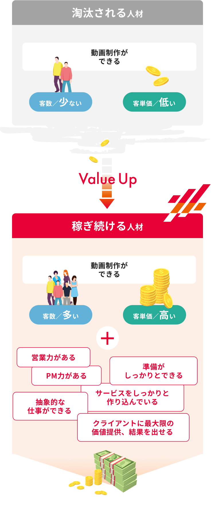 つまり、クリエイターとして売上をアップし、安定して稼ぎ続ける人材になるには、動画制作ができるだけではなく、